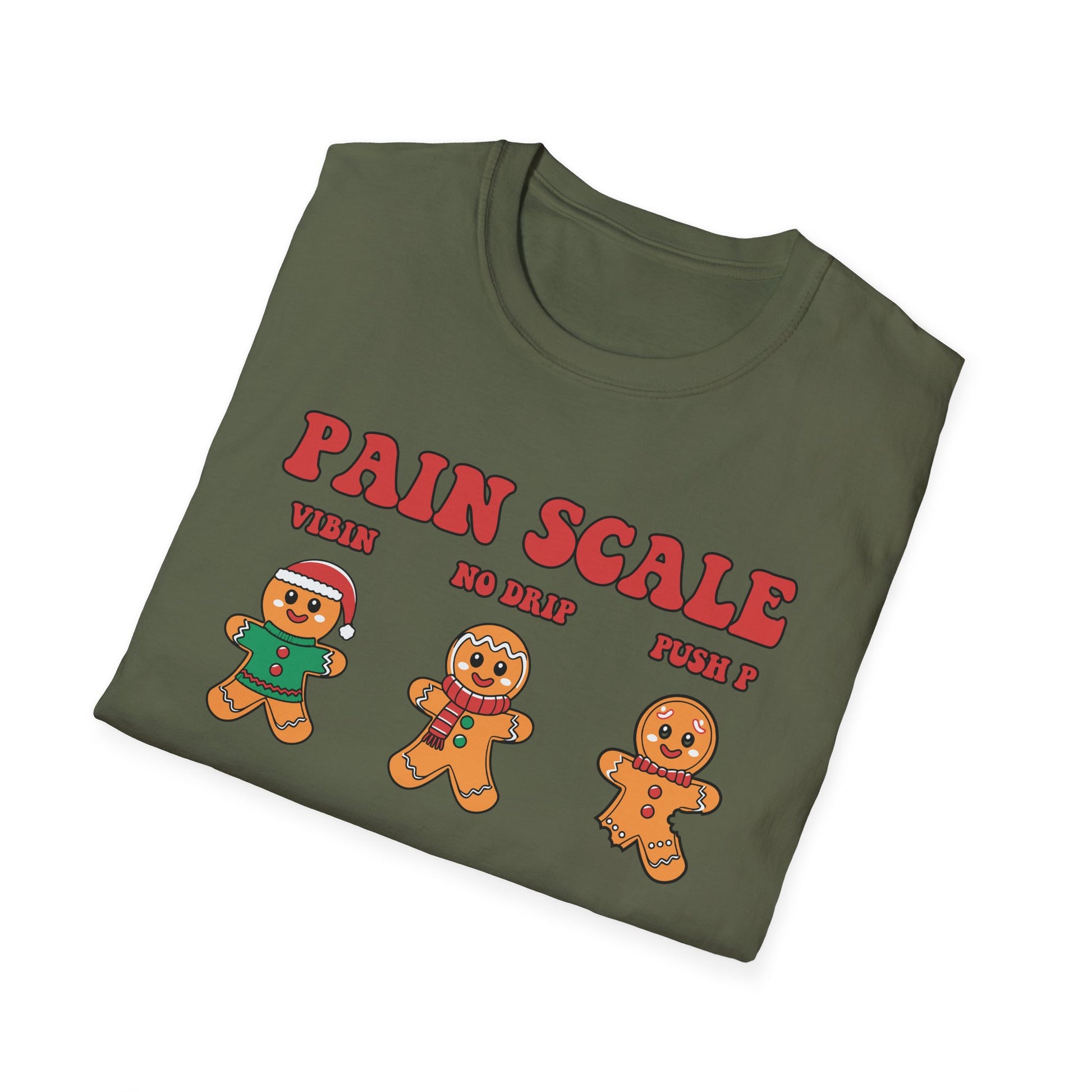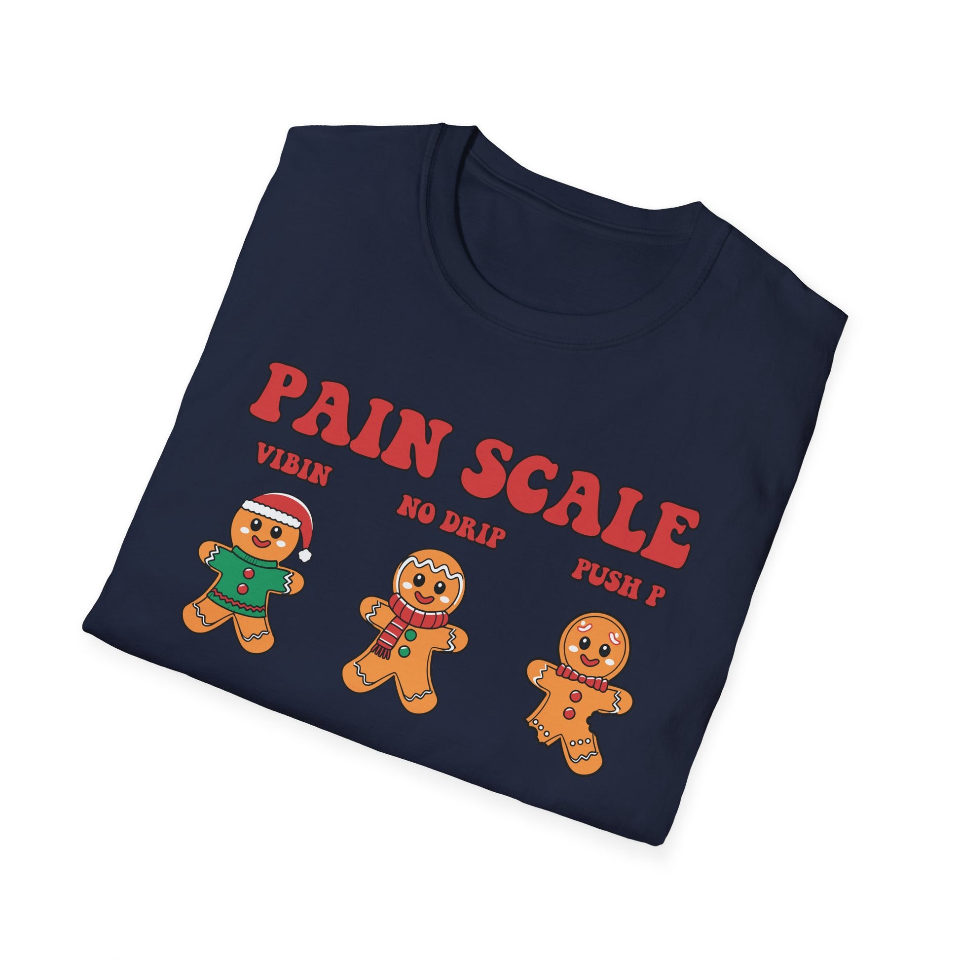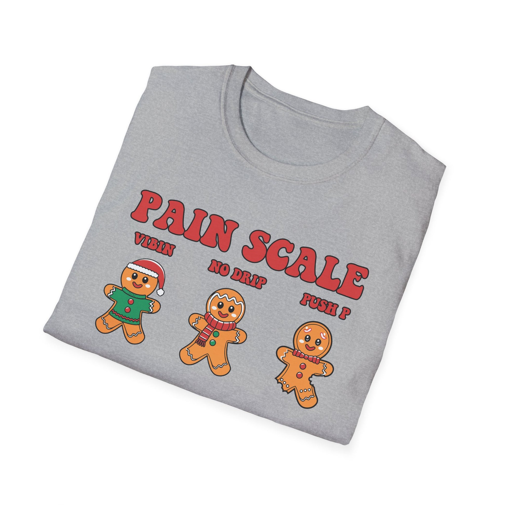 Wear a grin and a groan in equal measure with this playful gingerbread “Pain Scale” tee. Soft, lightweight cotton lays quiet while the print does the talking: a row of cookie characters showing everything from "vibes" and "mild ouch" to full-on meltdown and sugar shock. It’s cozy enough for slow mornings and loud enough to spark laughs at holiday gatherings, ugly-sweater swaps, or a chilled cookie-baking night with friends.