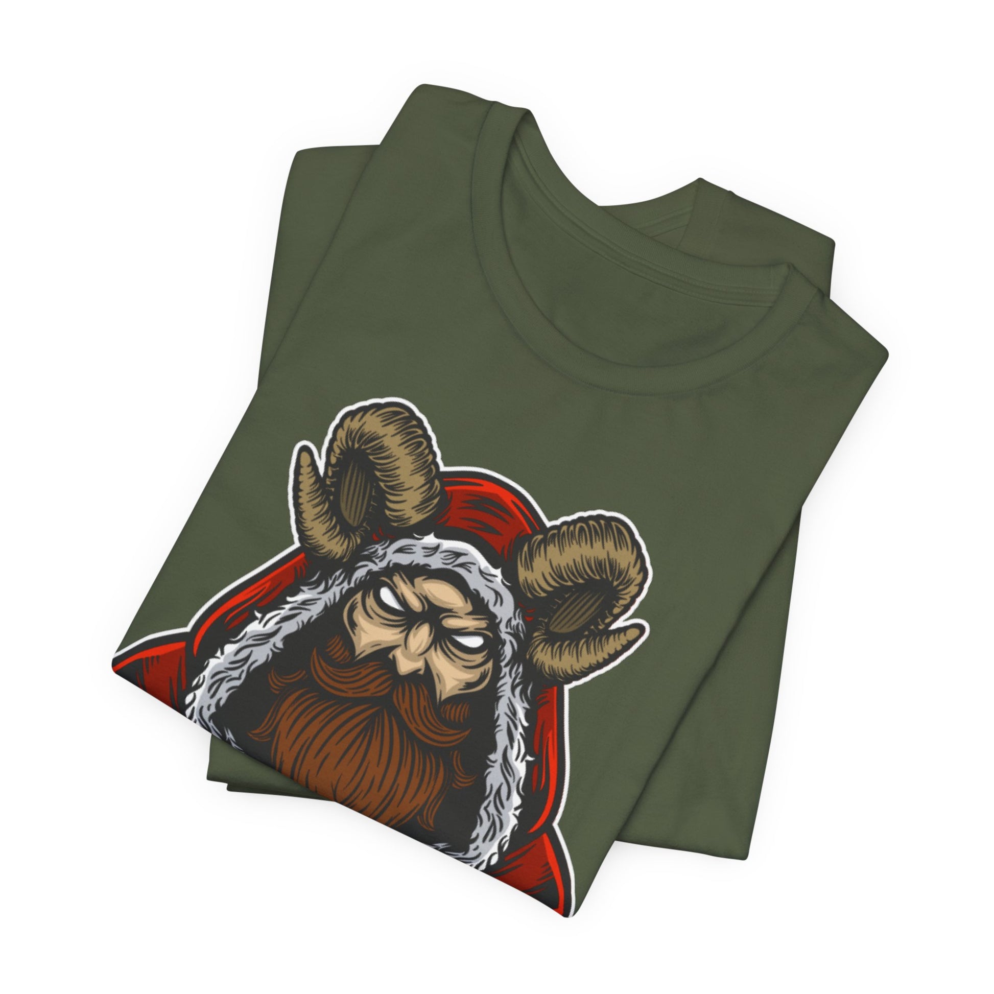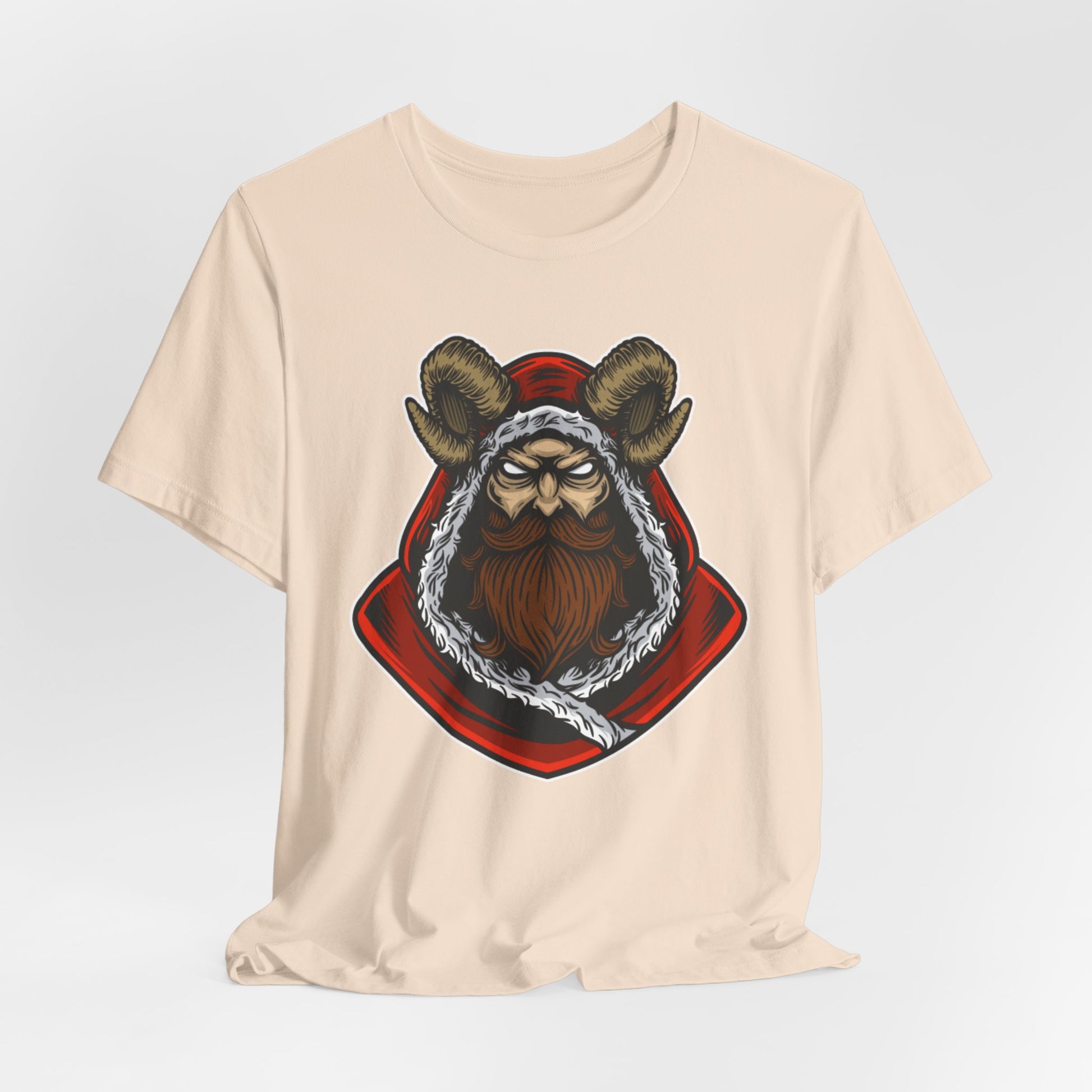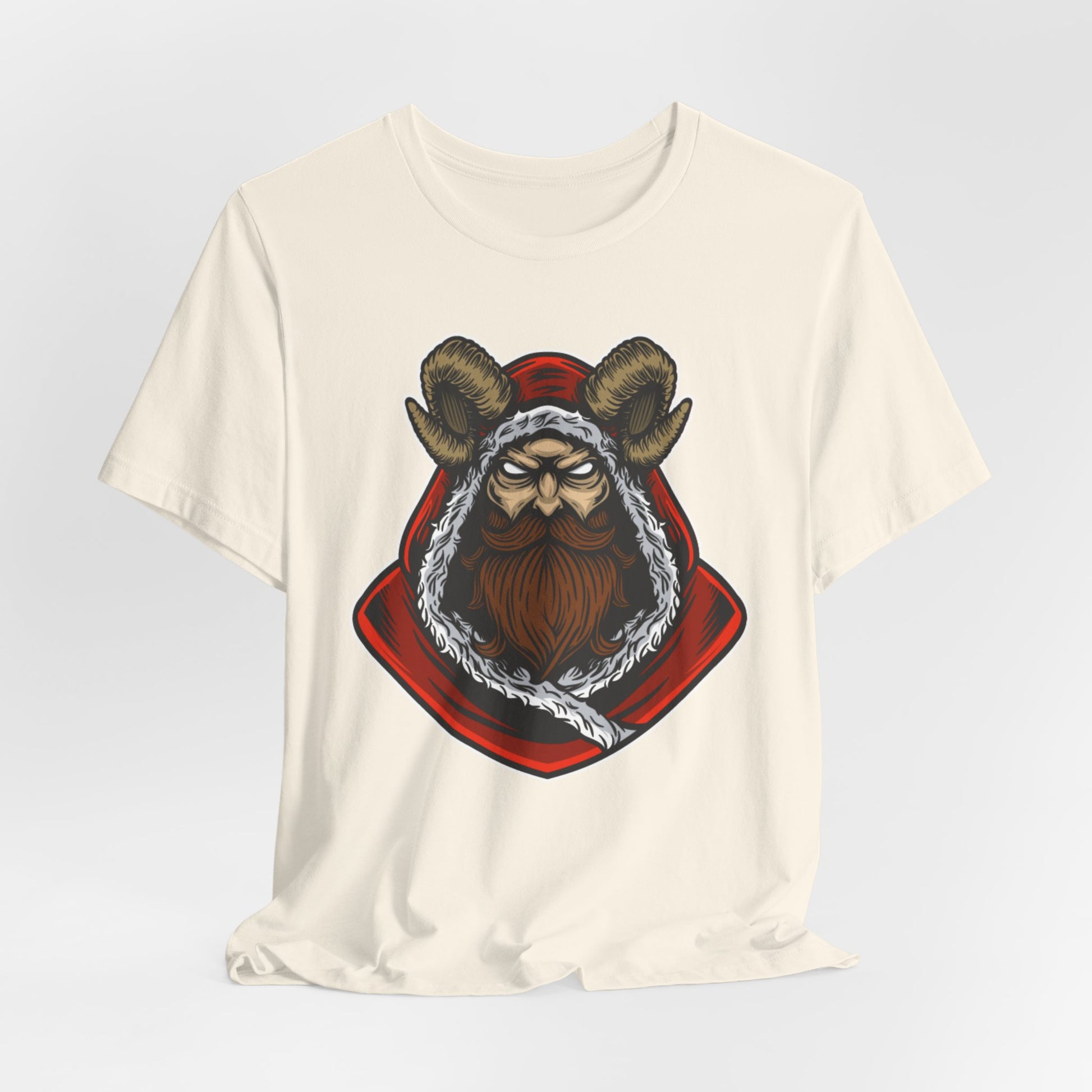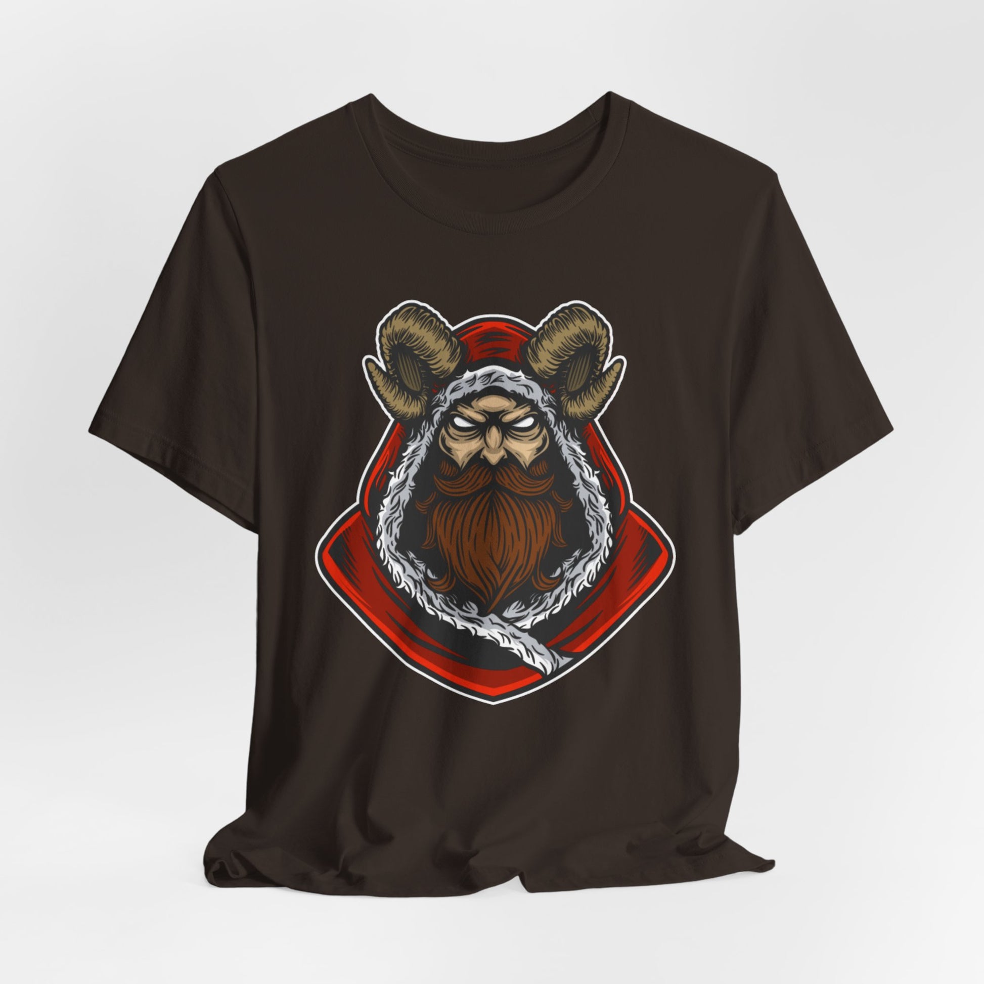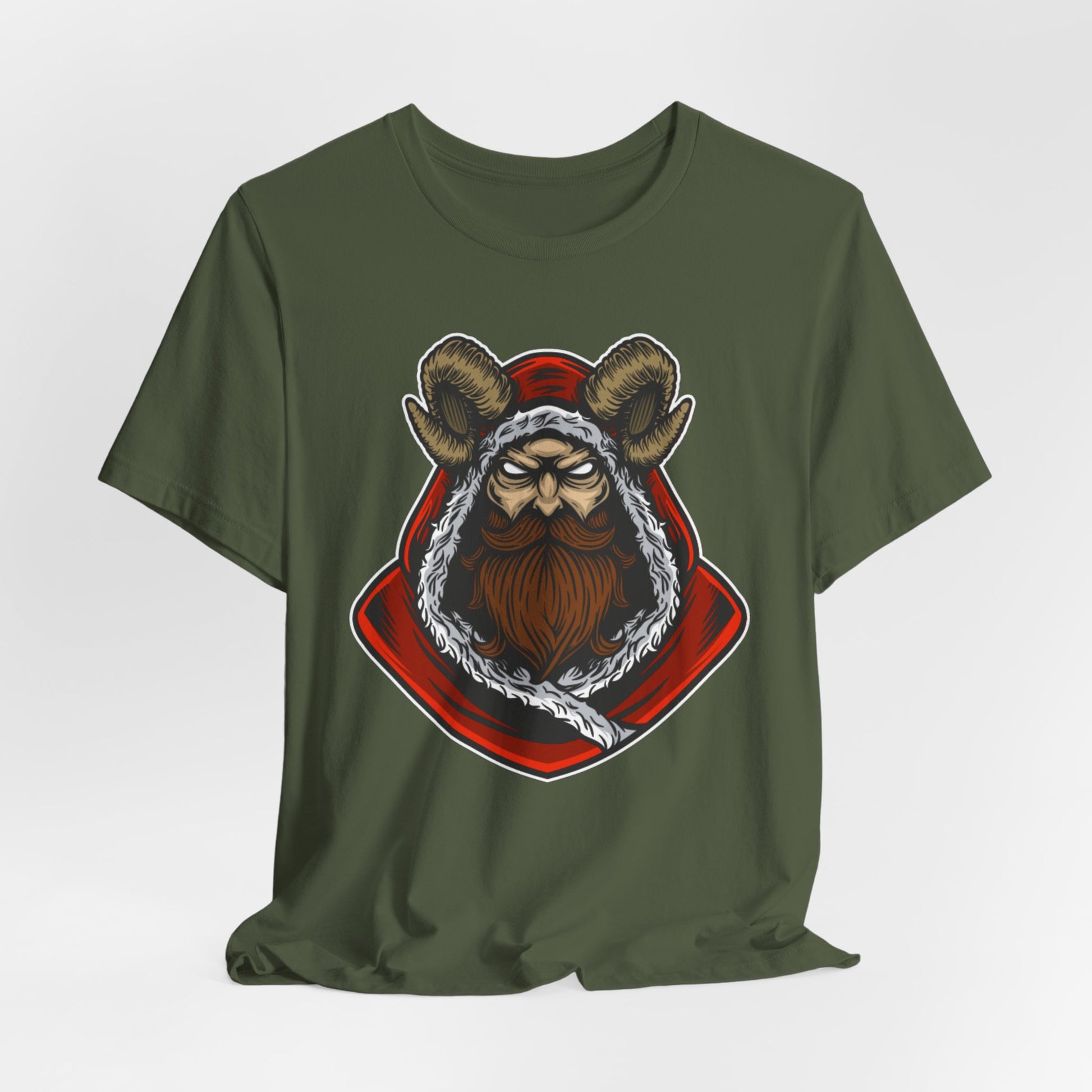 This lightweight jersey tee wears like a warm breath on a cold morning — soft, breathable, and built to last. At the center, a fierce, fur-capped bearded figure in a red hood gives the shirt bold, storybook energy: equal parts wanderer and guardian from old northern tales. The print’s details come through crisp and vivid, so the beard, fur trim and horned cap read clearly from across a room. Wear it for long hikes, campfire nights, or lazy weekends when you want a touch of rugged folklore in your outfit. The crew neck and retail fit keep the silhouette clean and easy to layer under jackets or over flannels, while the tear-away label and quality cotton make it comfortable against the skin all day.