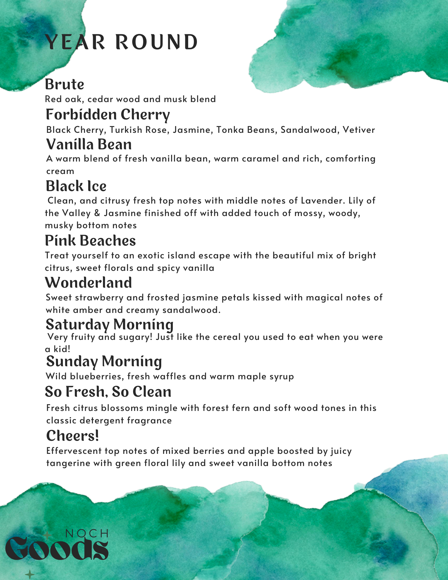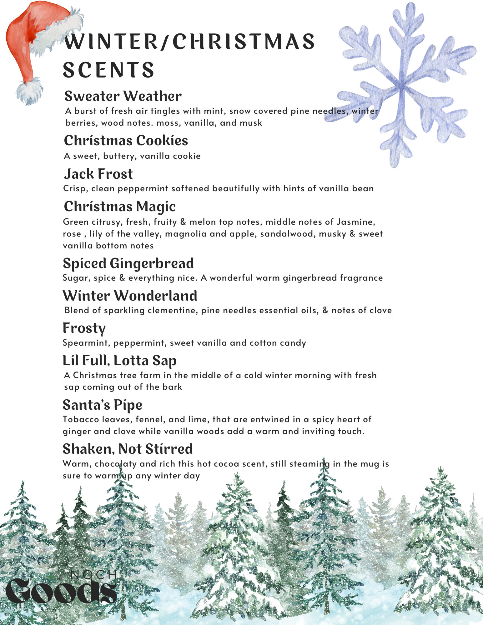 *Sweater Weather: A burst of fresh air tingles with mint, snow covered pine needles, winter berries, wood notes. moss, vanilla, and musk.