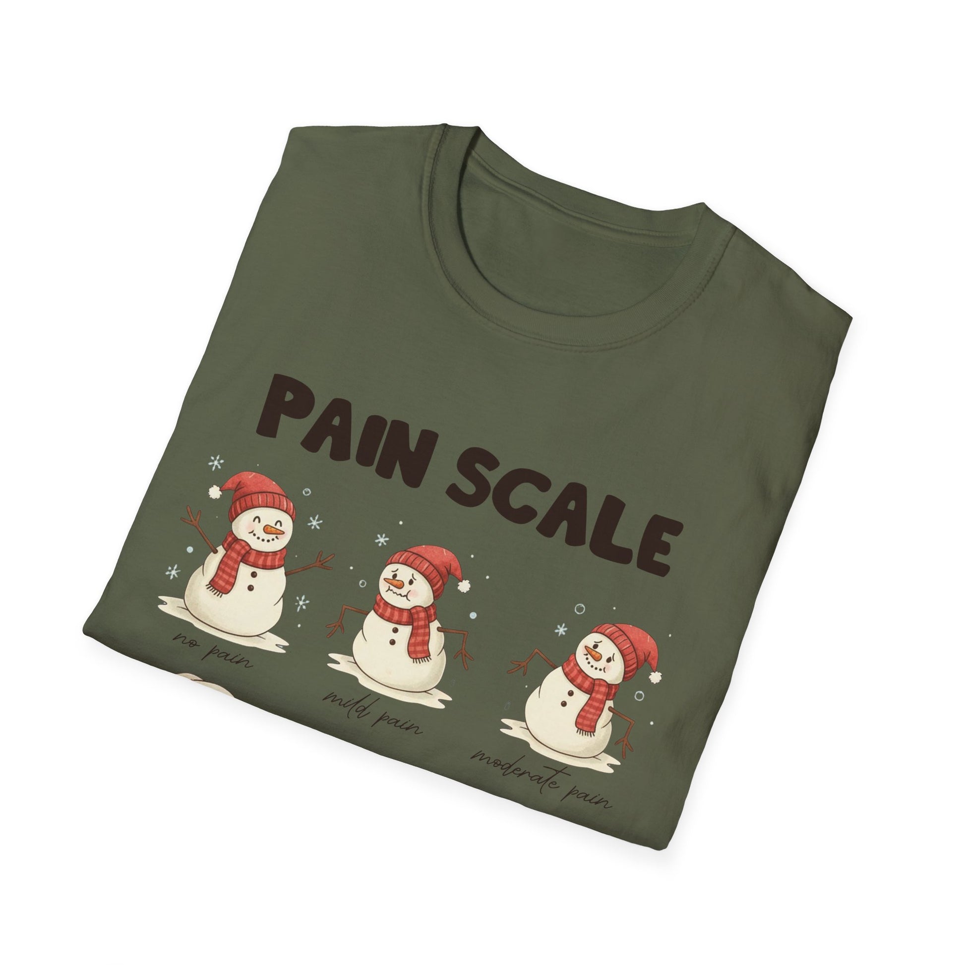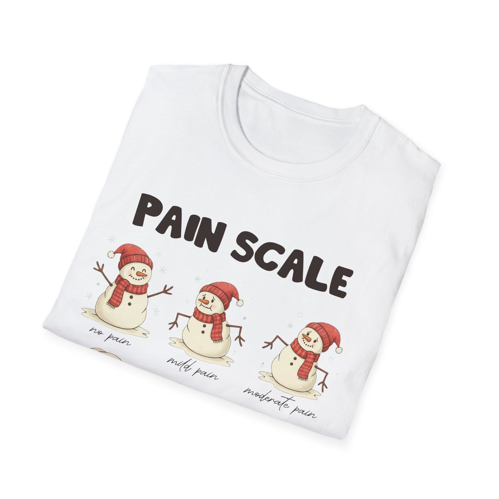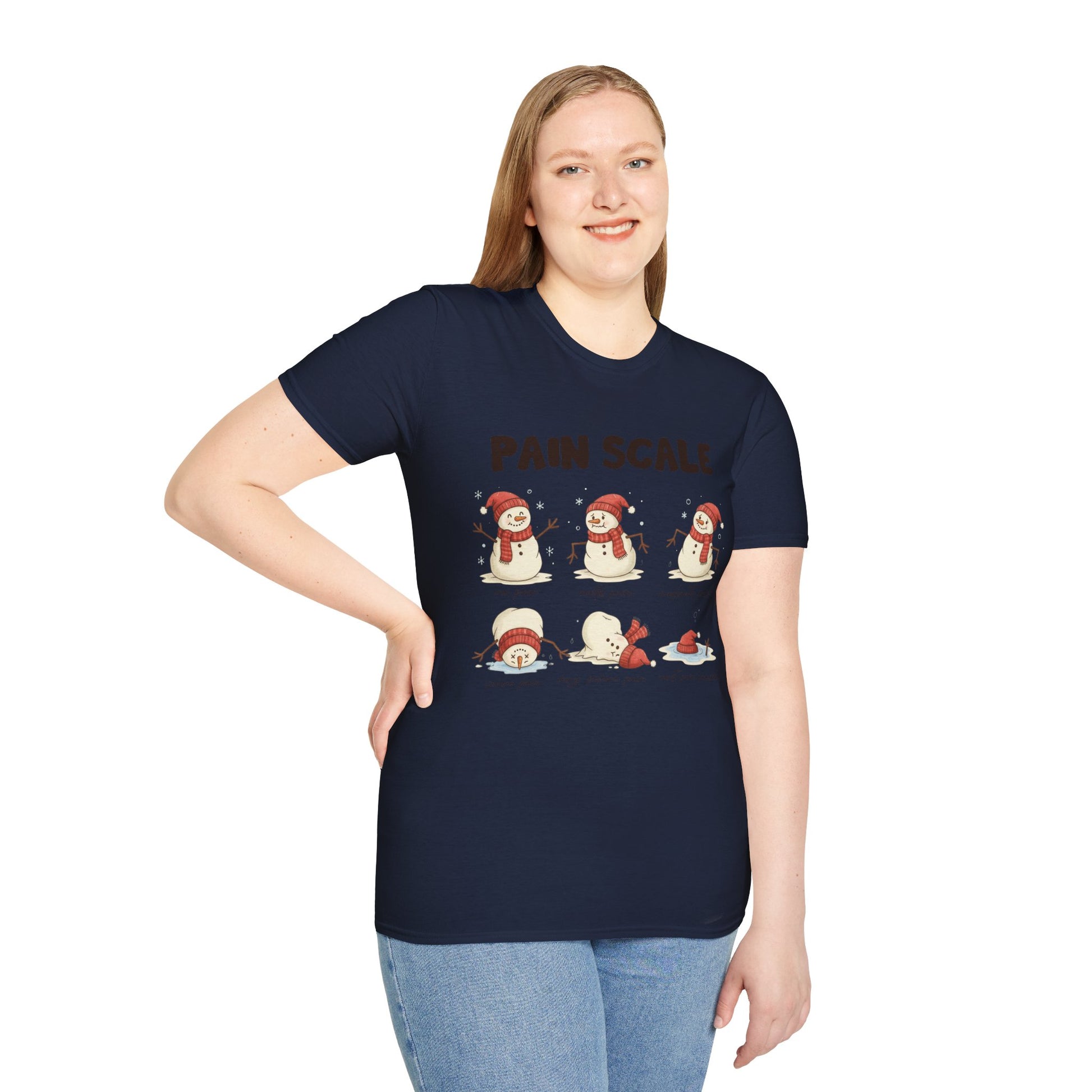 This lightweight tee carries a playful winter mood with a cheeky “Pain Scale” snowman illustration across the chest. Soft, breathable cotton and a classic crew neckline make it an easy layer for chilly mornings, tree-lighting walks, or cozying up with cocoa. The artwork balances sweet and sardonic — little snowmen move from cheerful to dramatically flattened — so it pairs well with casual denim, pajama bottoms, or layered under a flannel for a relaxed holiday look. It’s the kind of shirt that sparks smiles from fellow winter-lovers, breaks the ice at casual gatherings, and brings a low-key, witty energy to seasonally themed outfits.